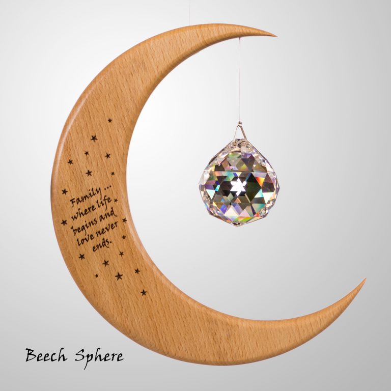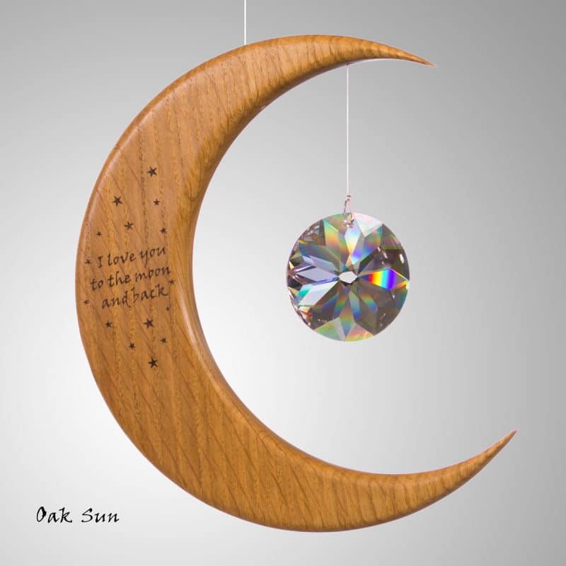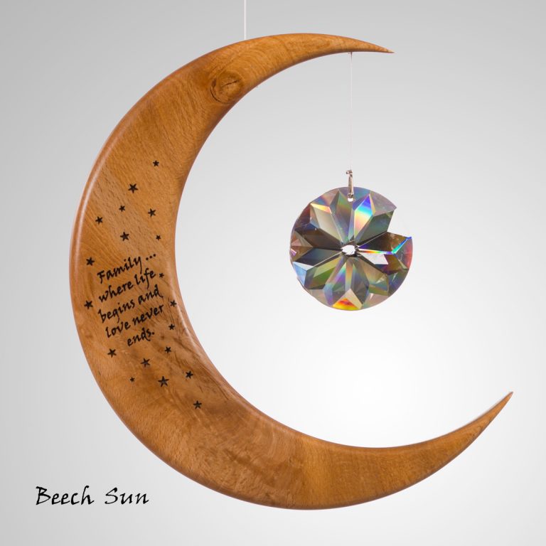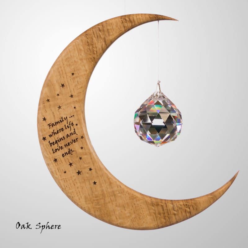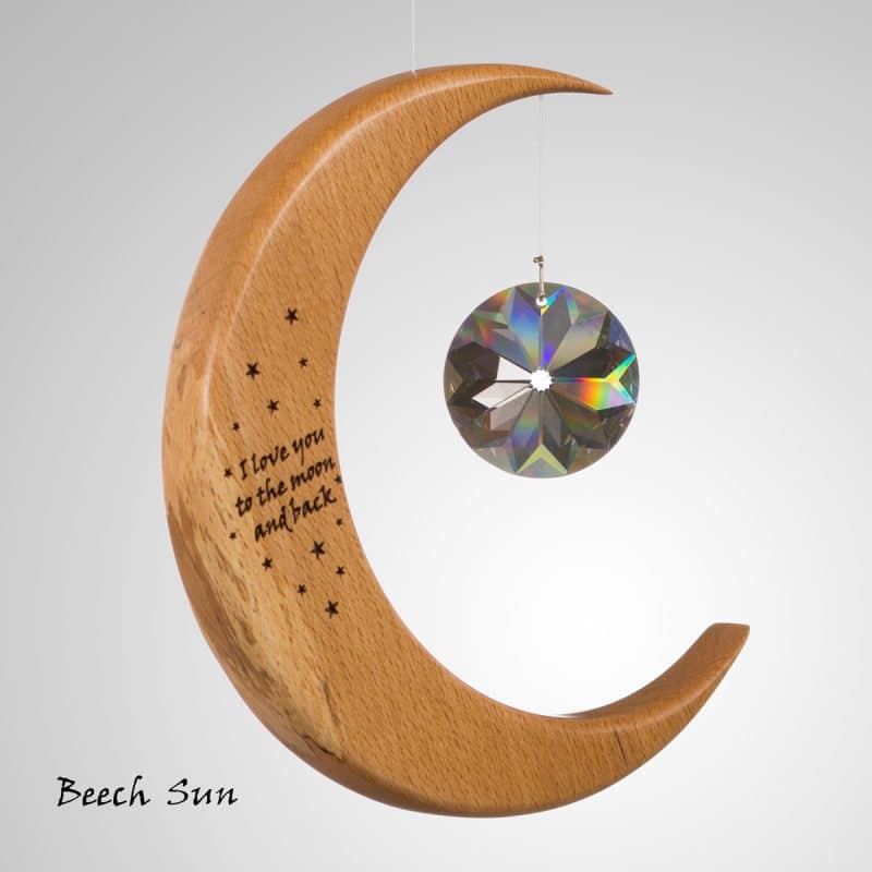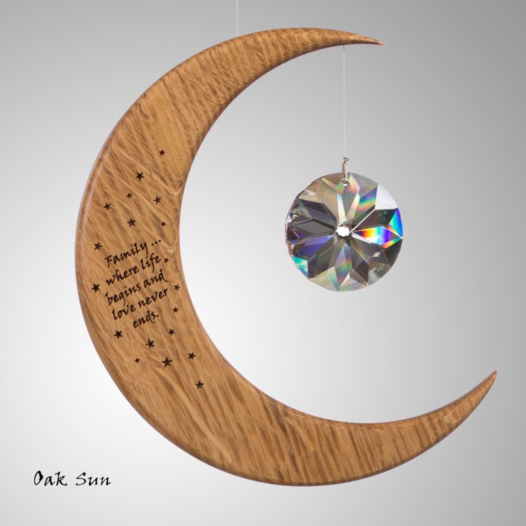 These are unique wood and crystal Large Moon Suncatchers with a selection of popular sayings inscribed into the wood, which we make in Co. Leitrim, Ireland.