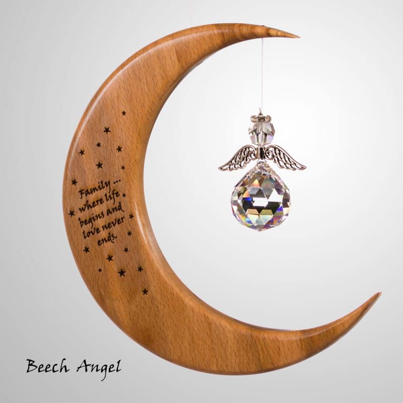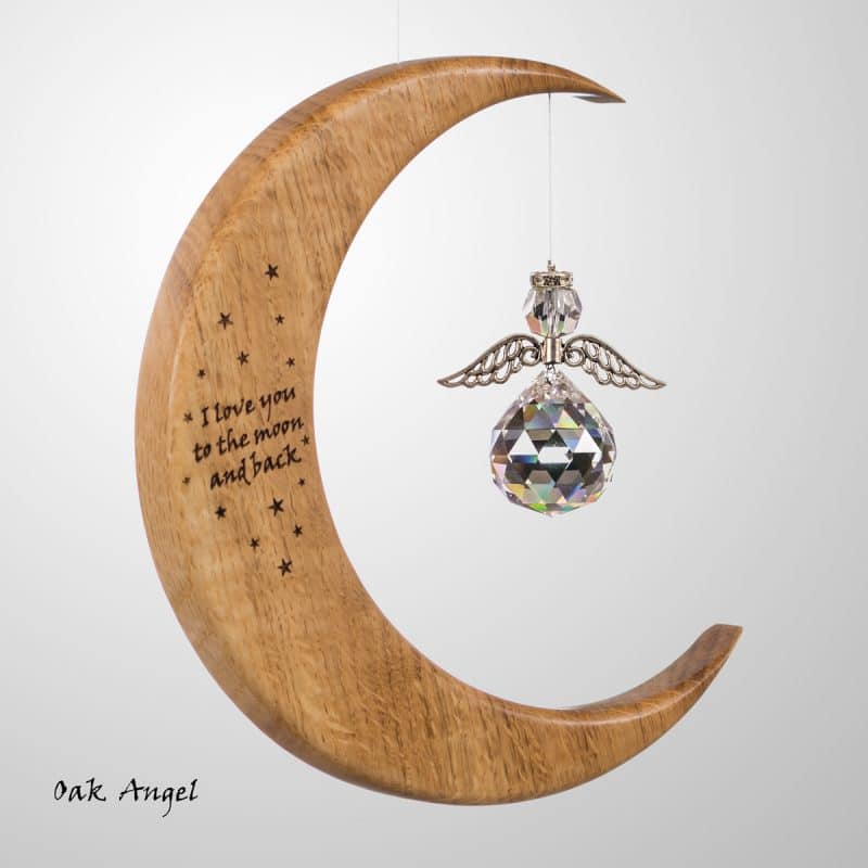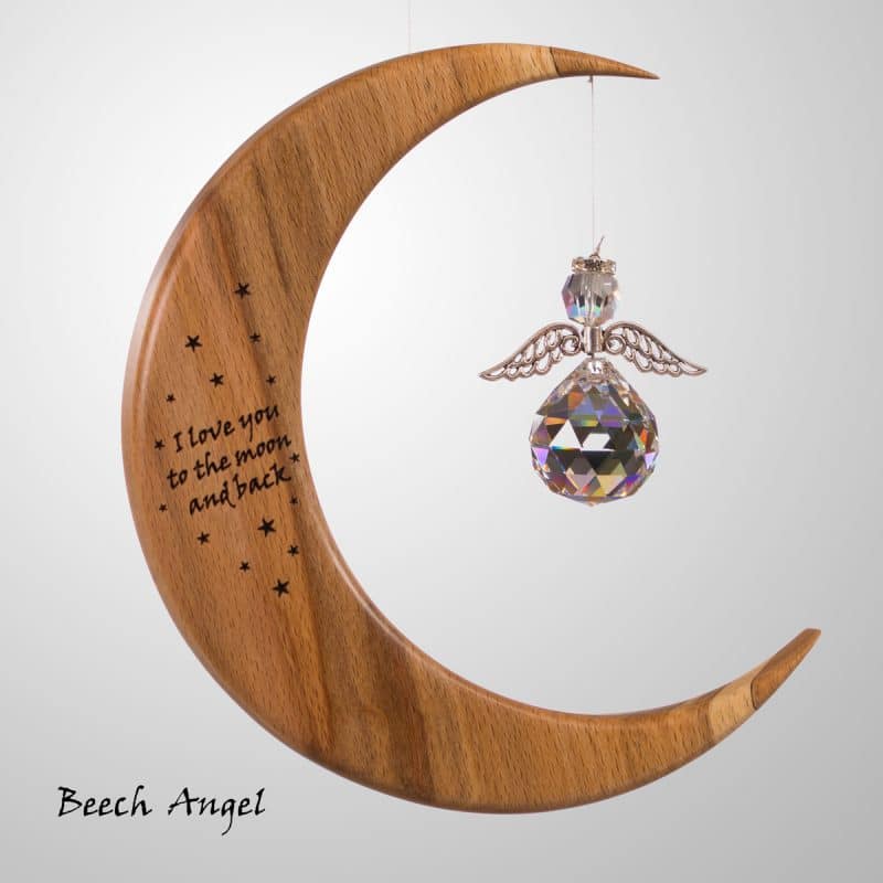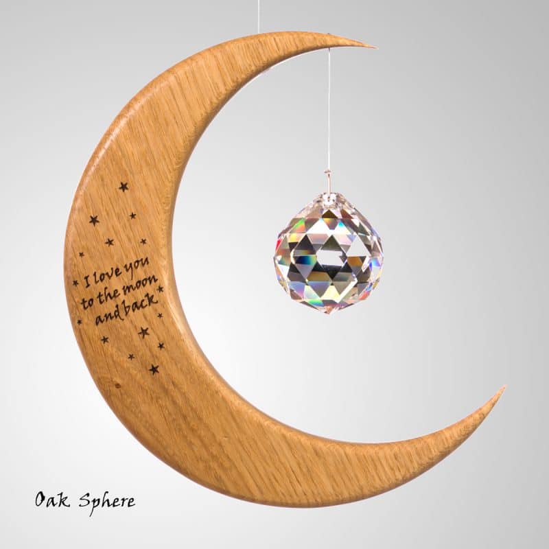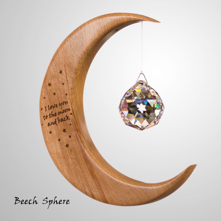 These are unique wood and crystal Large Moon Suncatchers with a selection of popular sayings inscribed into the wood, which we make in Co. Leitrim, Ireland.