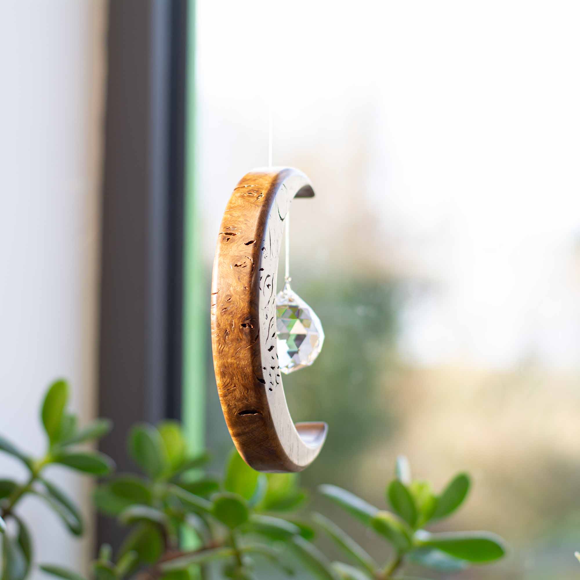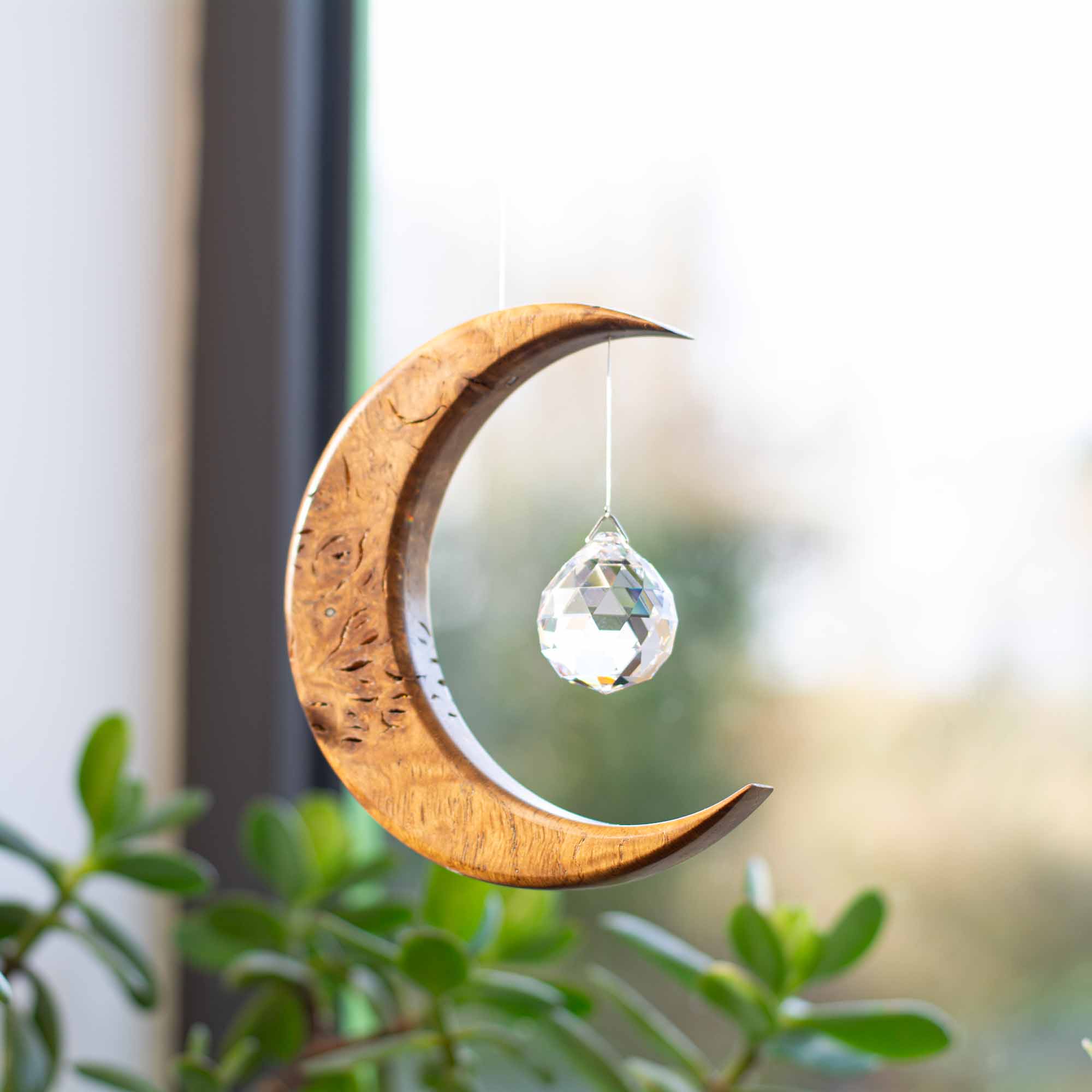 Each moon is created in our Artwood workshop in Ireland, then finished with multiple coats of Danish oil before being carefully buffed and sealed with carnauba wax for a smooth, natural sheen. It is then paired with a premium Asfour crystal sphere that scatters soft, colourful rainbows whenever sunlight touches it.