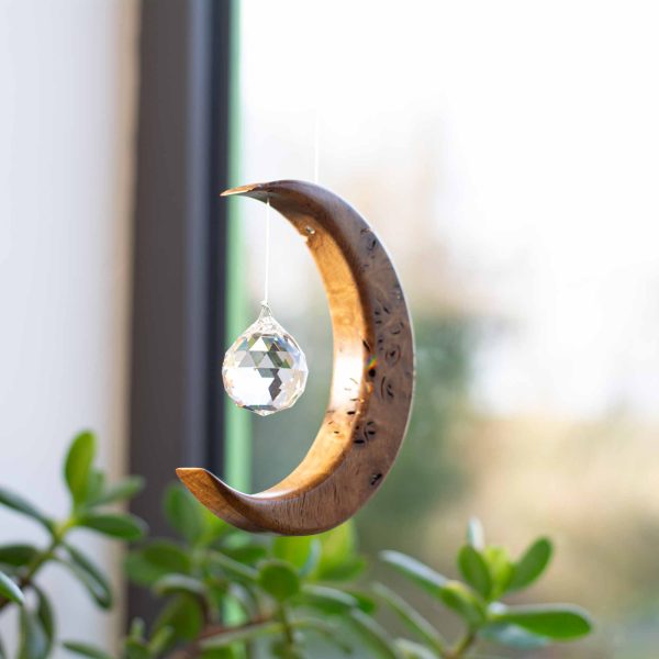 Each moon is created in our Artwood workshop in Ireland, then finished with multiple coats of Danish oil before being carefully buffed and sealed with carnauba wax for a smooth, natural sheen. It is then paired with a premium Asfour crystal sphere that scatters soft, colourful rainbows whenever sunlight touches it.