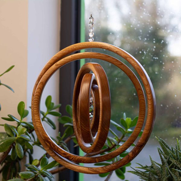 These unique wood and crystal window-hangings are shaped as Concentric Ring Suncatchers. When you hang one in a window, the sunlight catches the crystal and spreads colourful rainbows around your room. In addition, all of the wooden rings can move independently, which gives the piece a gentle flowing motion.