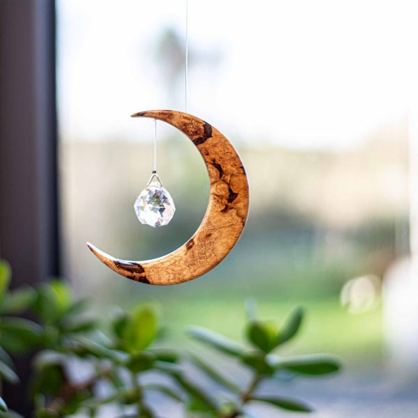 This limited edition moon suncatcher is handmade from rare Field Maple burl, a beautiful Irish hardwood known for its swirling natural grain. Every piece of this timber is naturally unique, so no two moons will ever look the same. You will receive the exact suncatcher shown in the photos and video — only one exists.