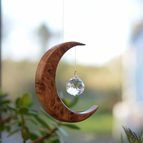 Each moon is created in our Artwood workshop in Ireland, then finished with multiple coats of Danish oil before being carefully buffed and sealed with carnauba wax for a smooth, natural sheen. It is then paired with a premium Swarovski crystal sphere that scatters soft, colourful rainbows whenever sunlight touches it.