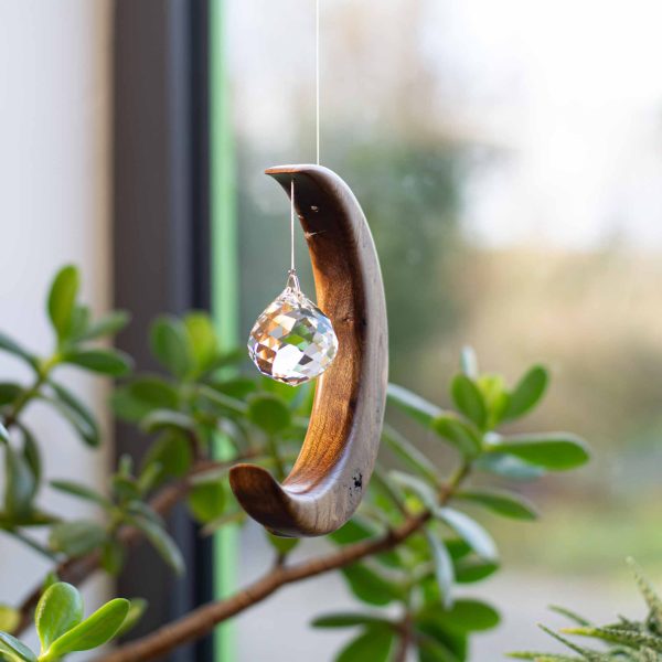 Each moon is created in our Artwood workshop in Ireland, then finished with multiple coats of Danish oil before being carefully buffed and sealed with carnauba wax for a smooth, natural sheen. It is then paired with a premium Swarovski crystal sphere that scatters soft, colourful rainbows whenever sunlight touches it.