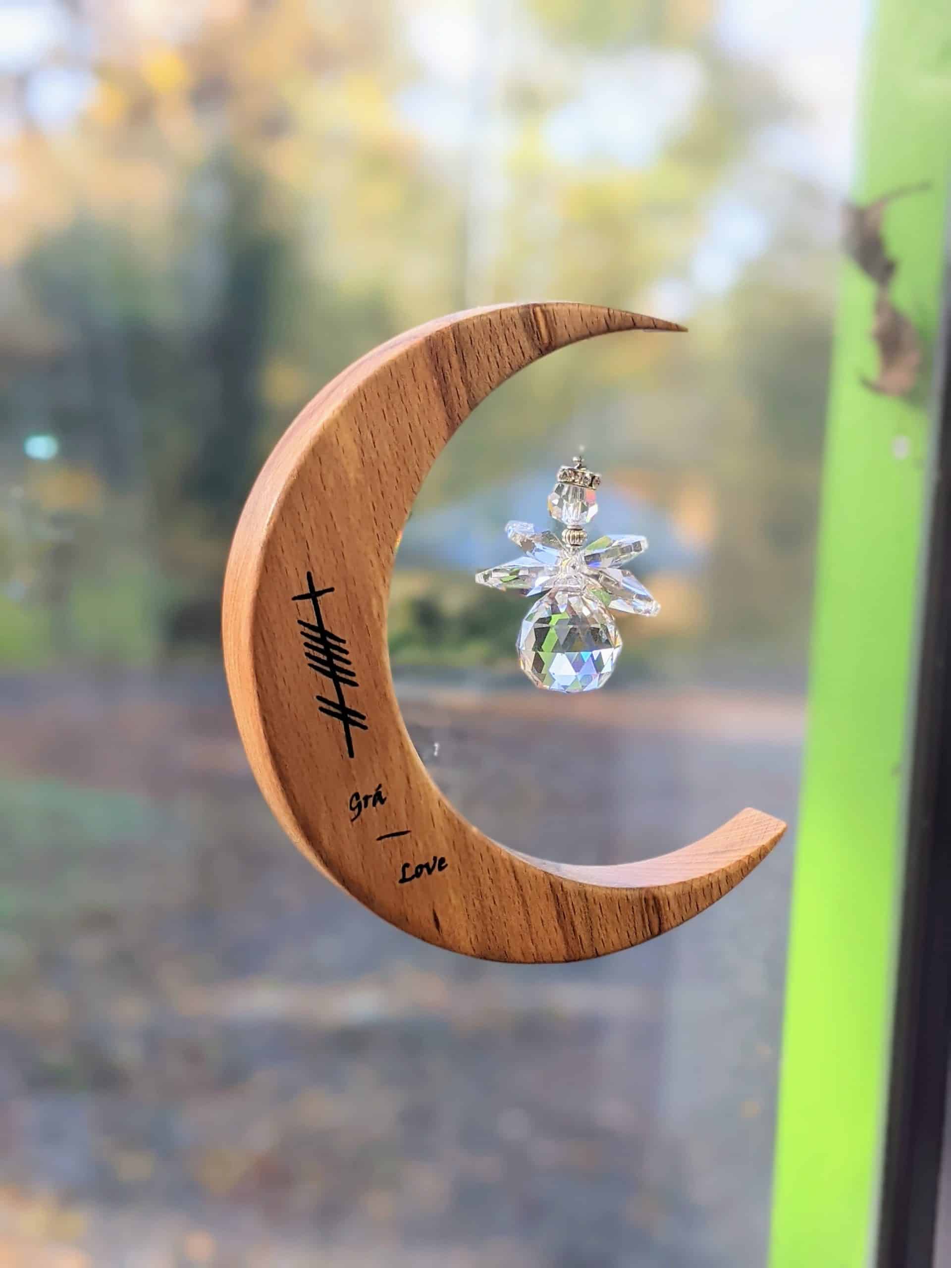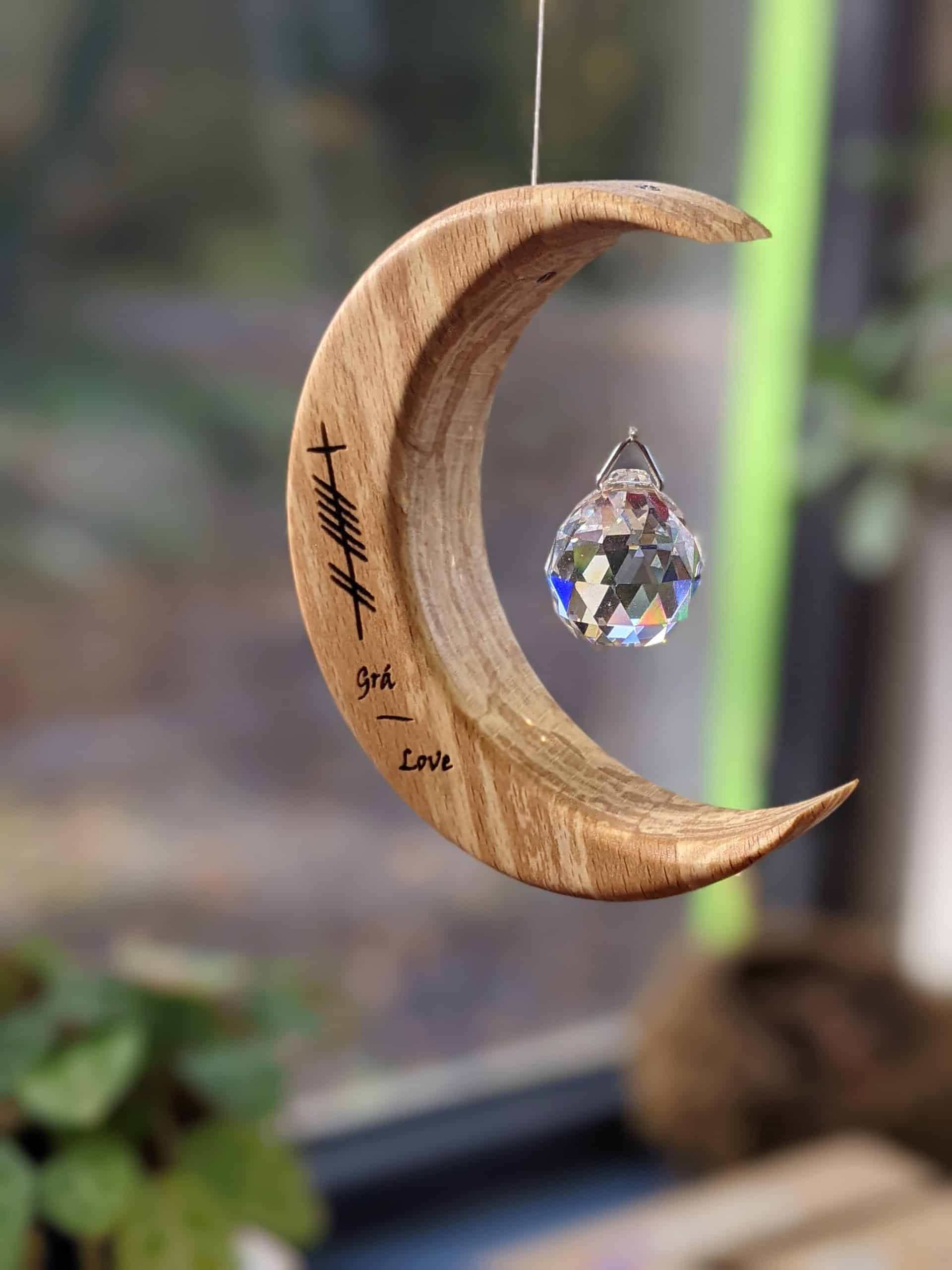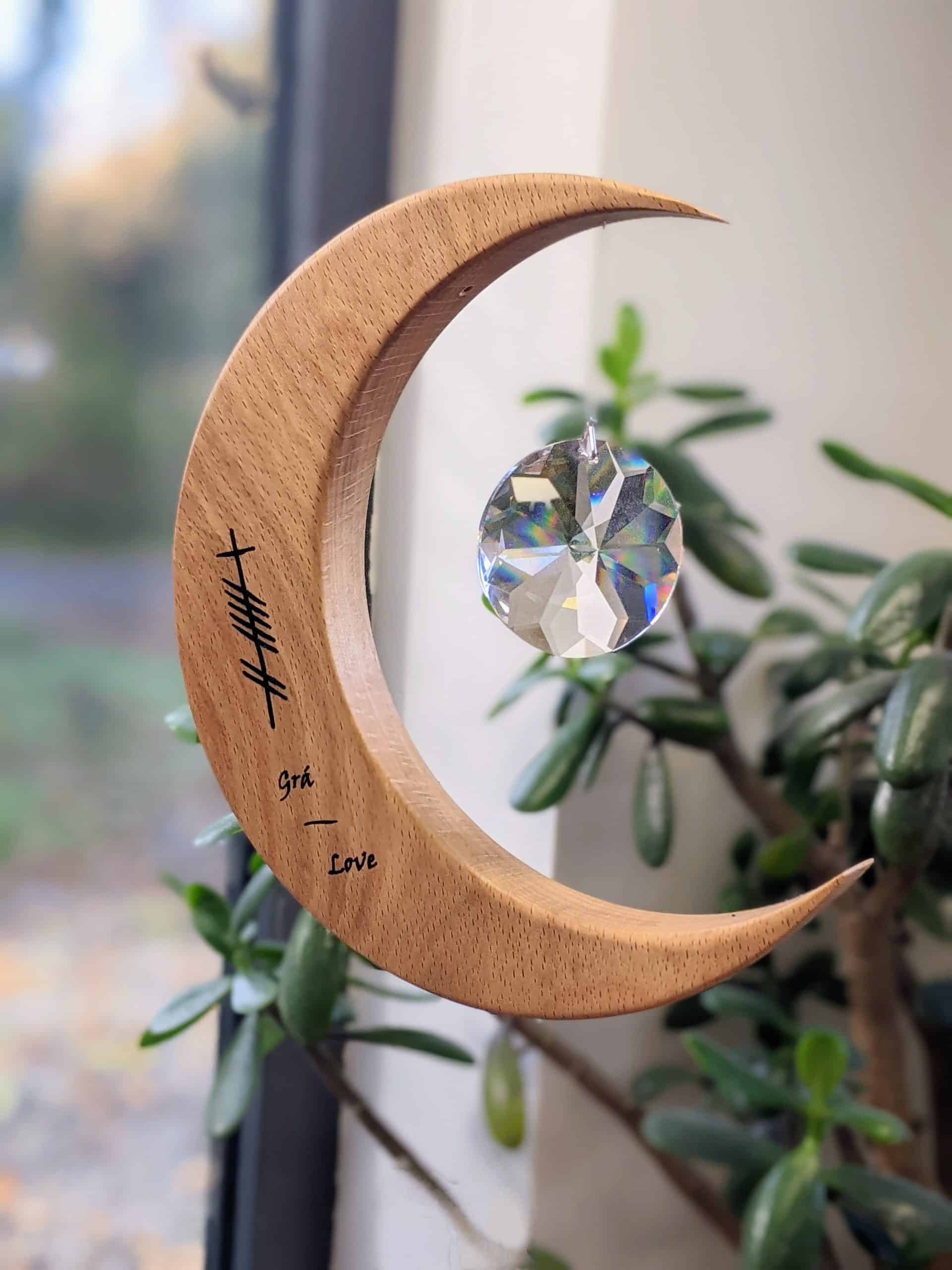 Crystals bring positive energy into homes. They particularly bestow hope, joy and good luck. They activate positive and diffuse negative energy. A hanging crystal such as this Ogham Inspired Moon Suncatcher can help to bring balance and calm into your space. They are especially useful in a Yoga room or meditation space.