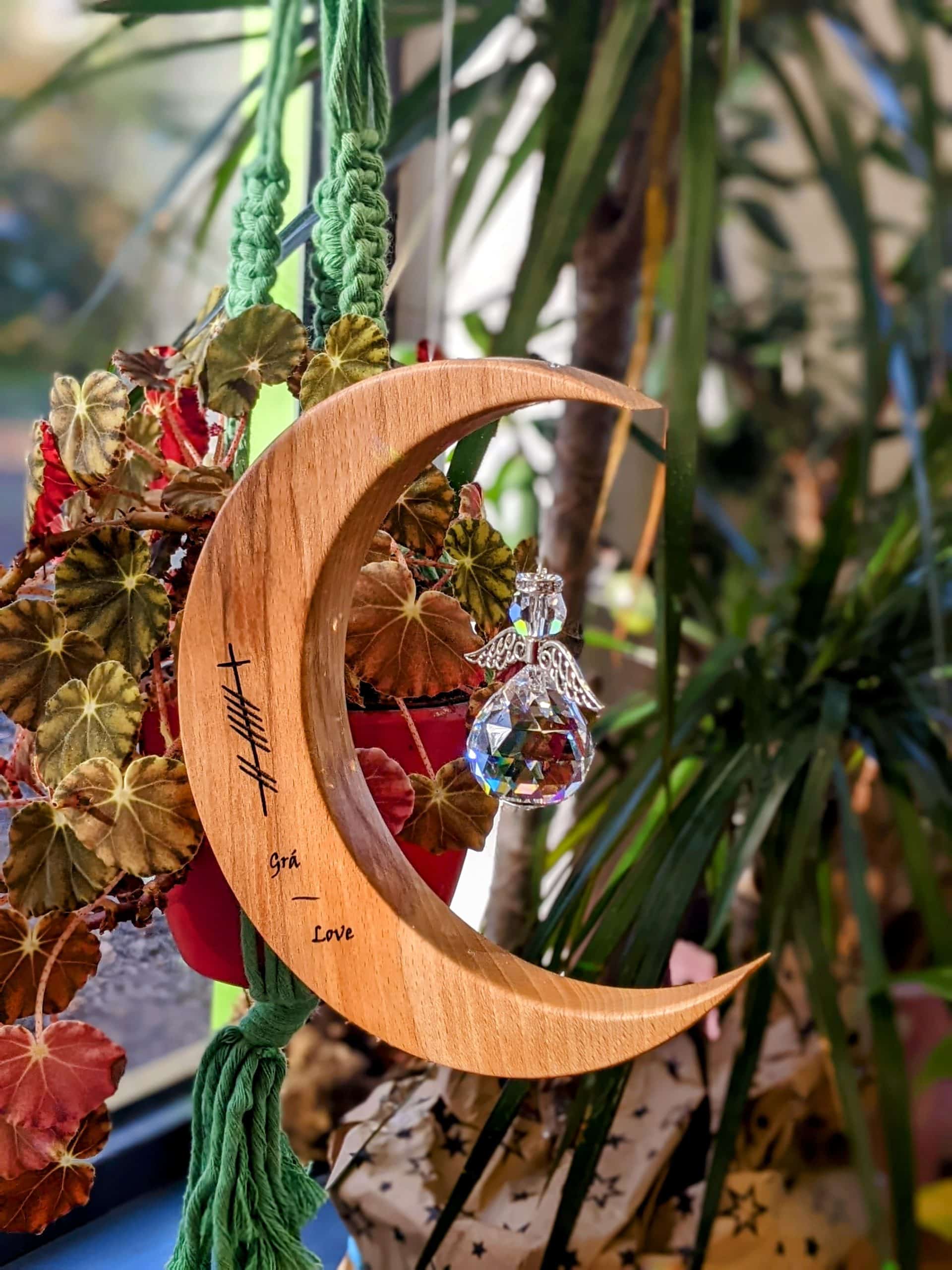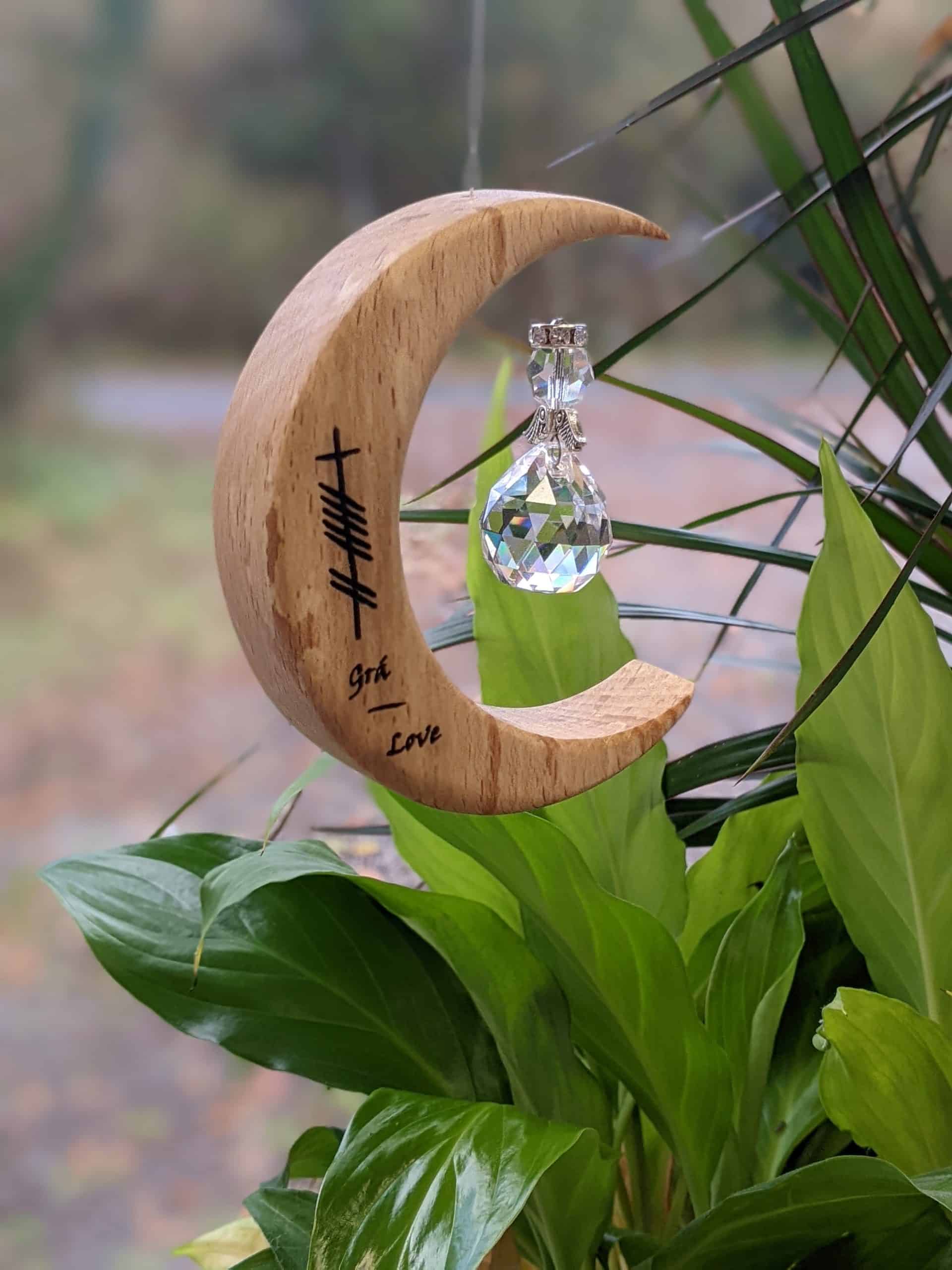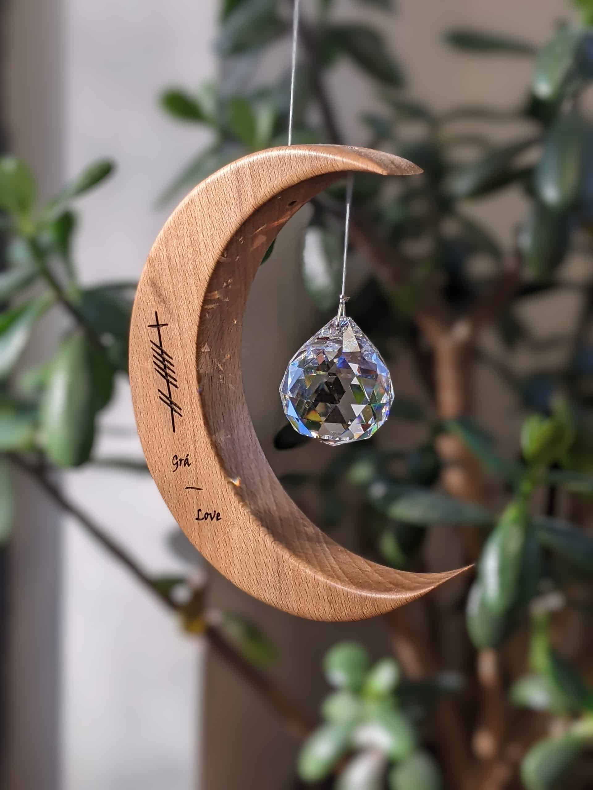 Crystals bring positive energy into homes. They particularly bestow hope, joy and good luck. They activate positive and diffuse negative energy. A hanging crystal such as this Ogham Inspired Moon Suncatcher can help to bring balance and calm into your space. They are especially useful in a Yoga room or meditation space.