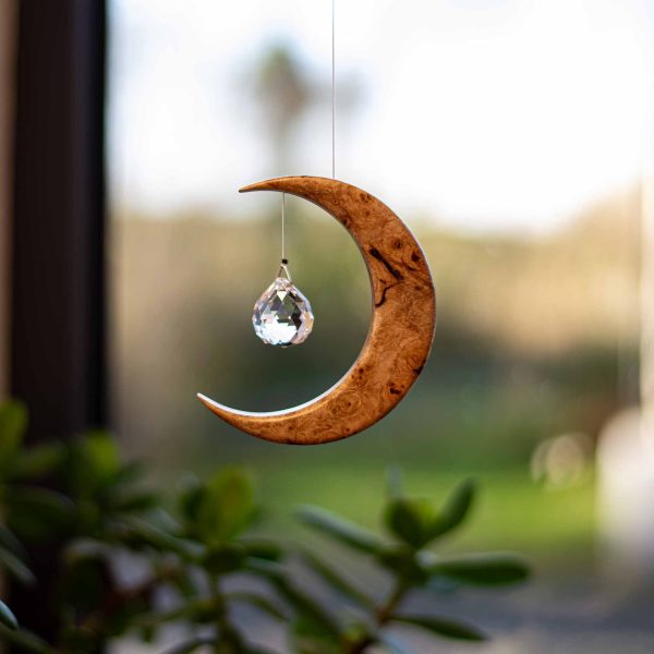 Each moon is created in our Artwood workshop in Ireland, then finished with multiple coats of Danish oil before being carefully buffed and sealed with carnauba wax for a smooth, natural sheen. It is then paired with a premium Asfour crystal sphere that scatters soft, colourful rainbows whenever sunlight touches it.