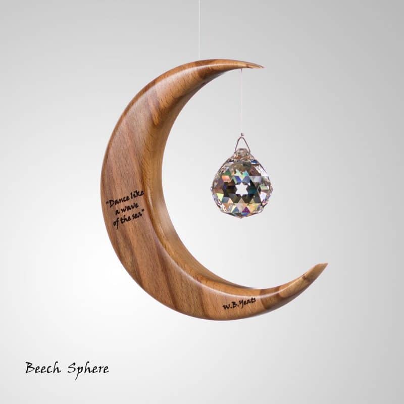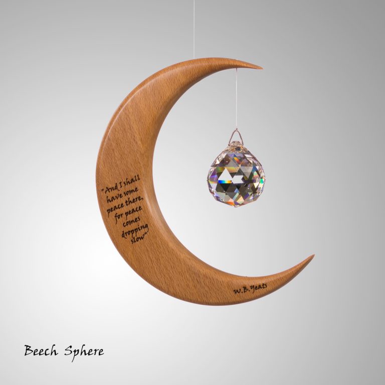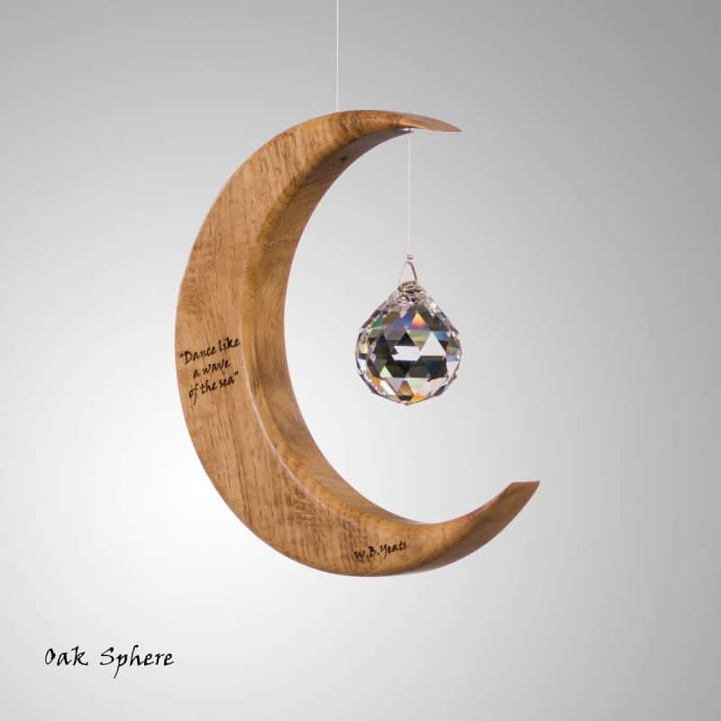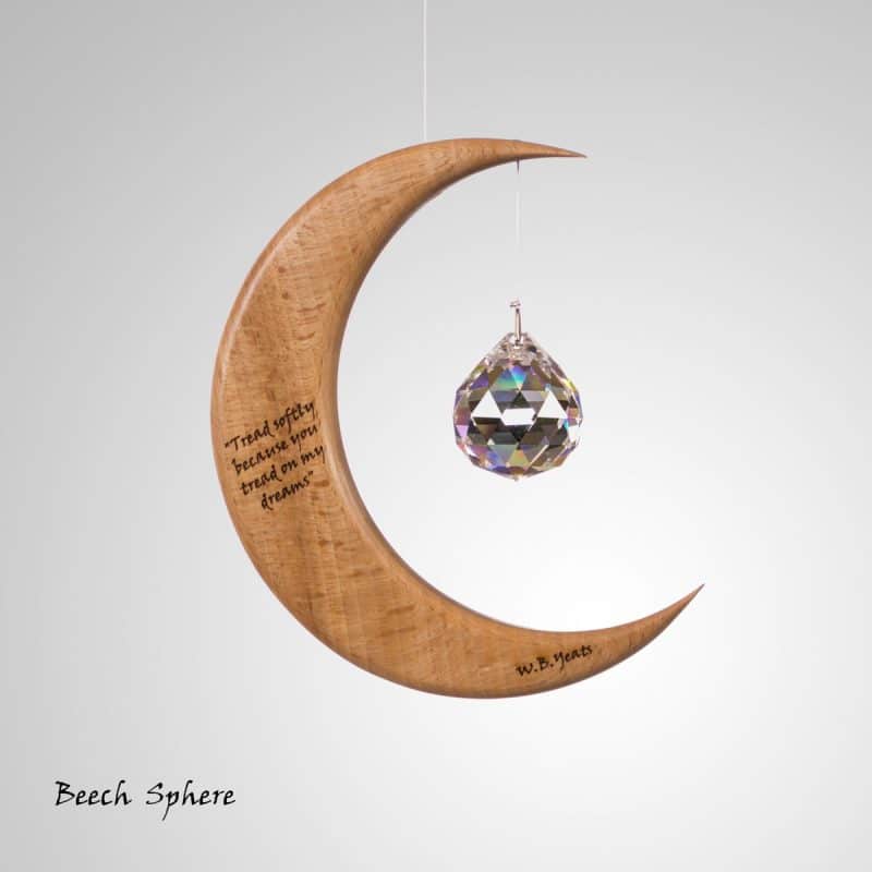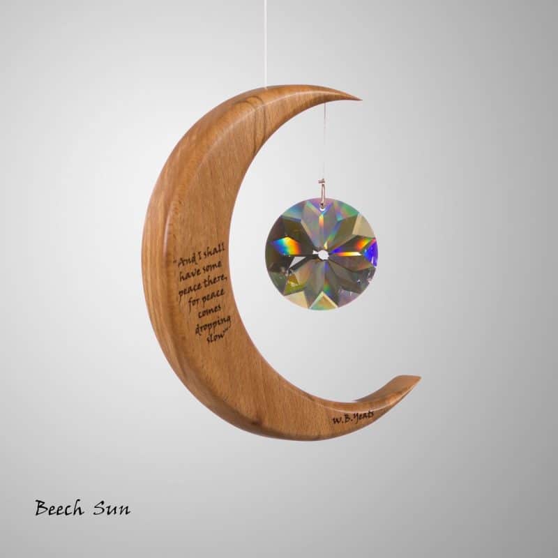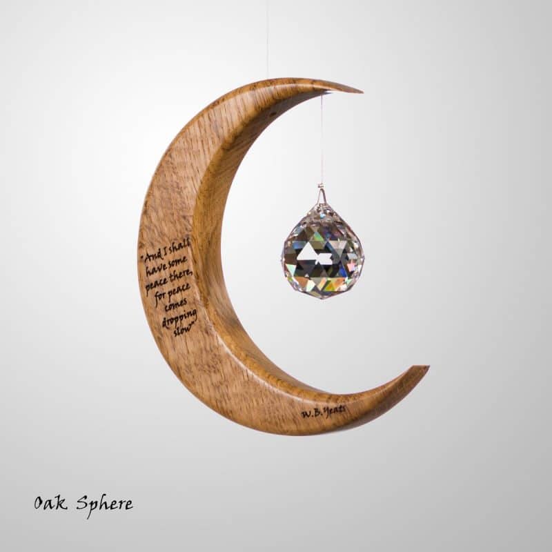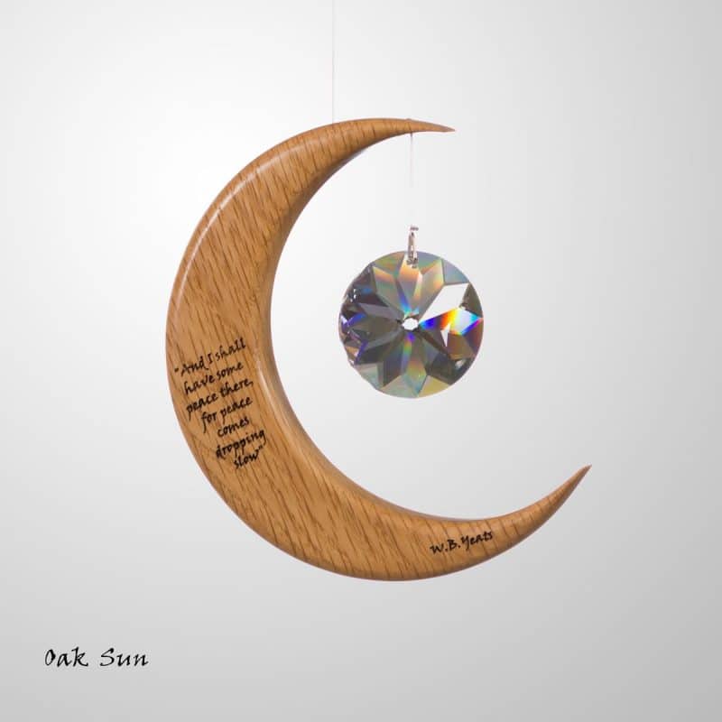 This is a unique wood and crystal Medium Moon Suncatcher with a Yeats quote inscribed into the wood, which we make in Co. Leitrim, Ireland.