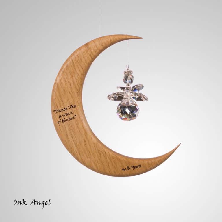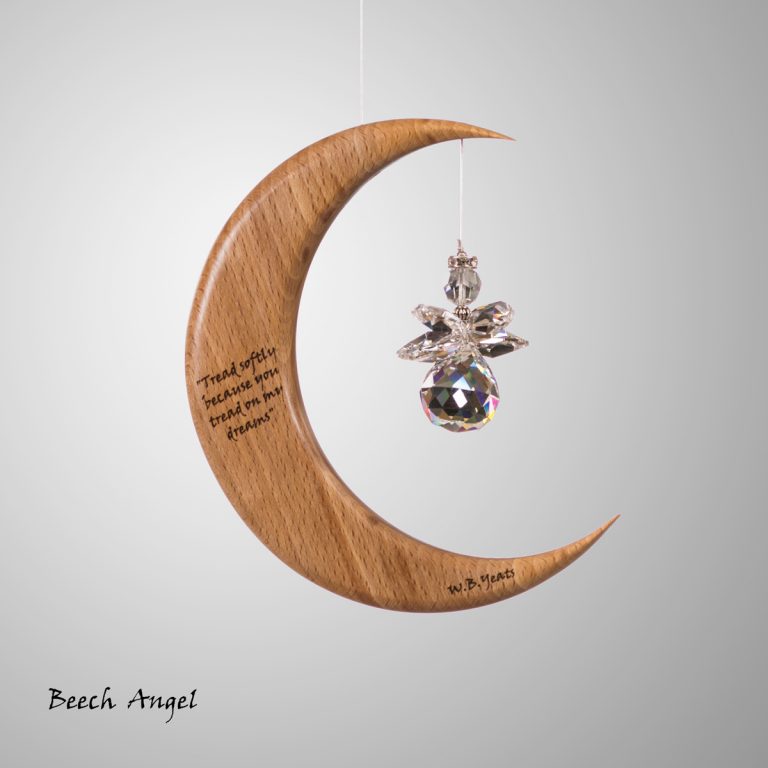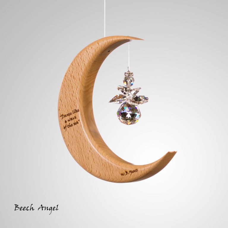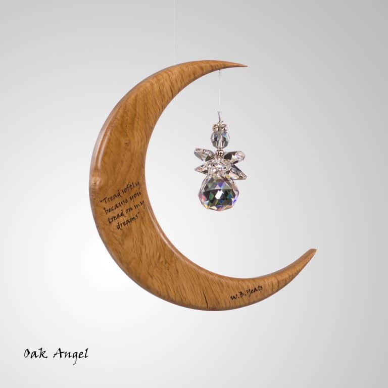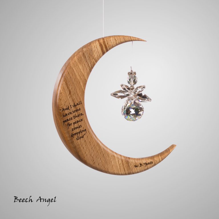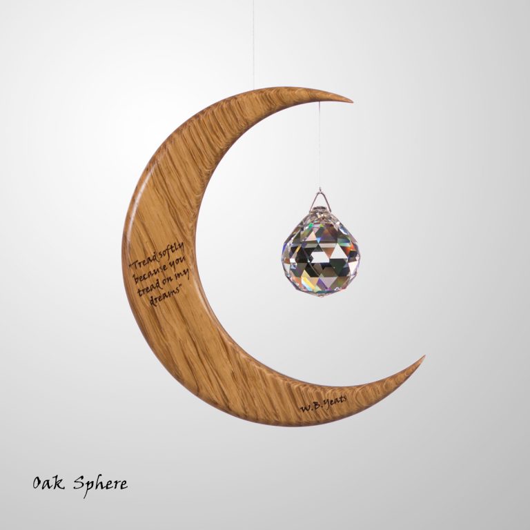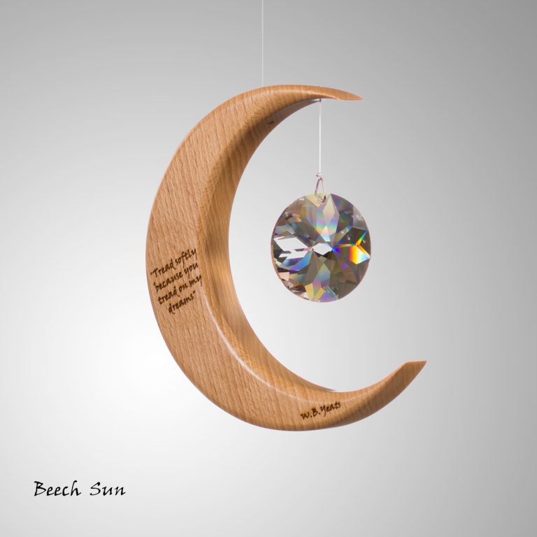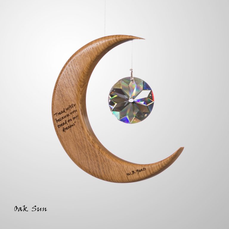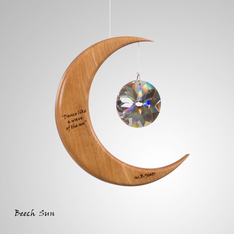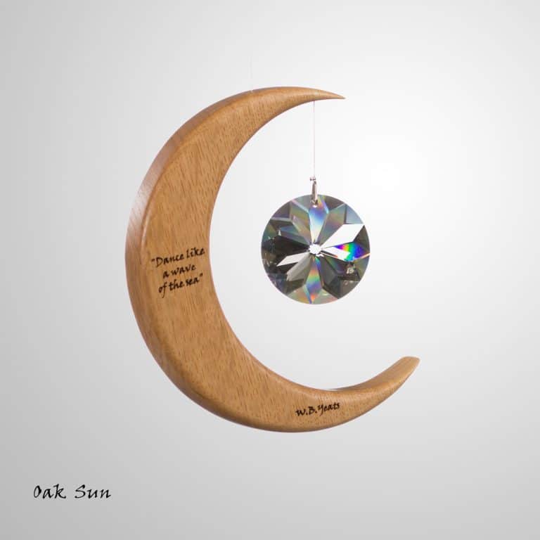 This is a unique wood and crystal Medium Moon Suncatcher with a Yeats quote inscribed into the wood, which we make in Co. Leitrim, Ireland.