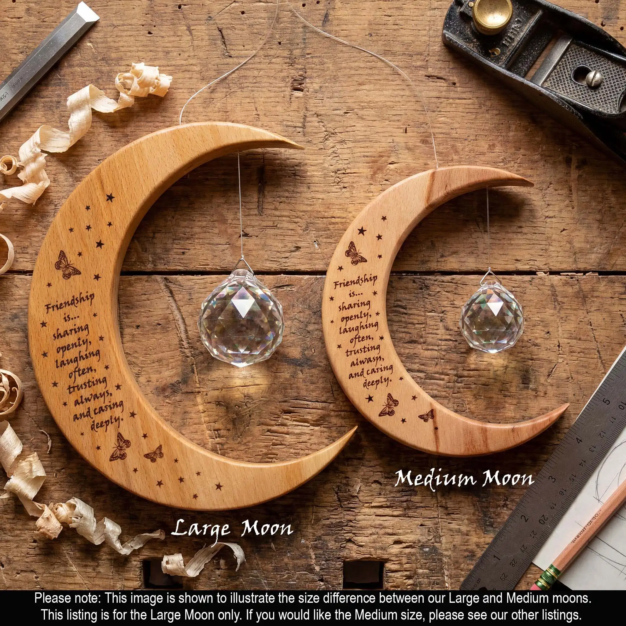 Wooden moon size: approx 6.5″ (165 mm) at its longest point