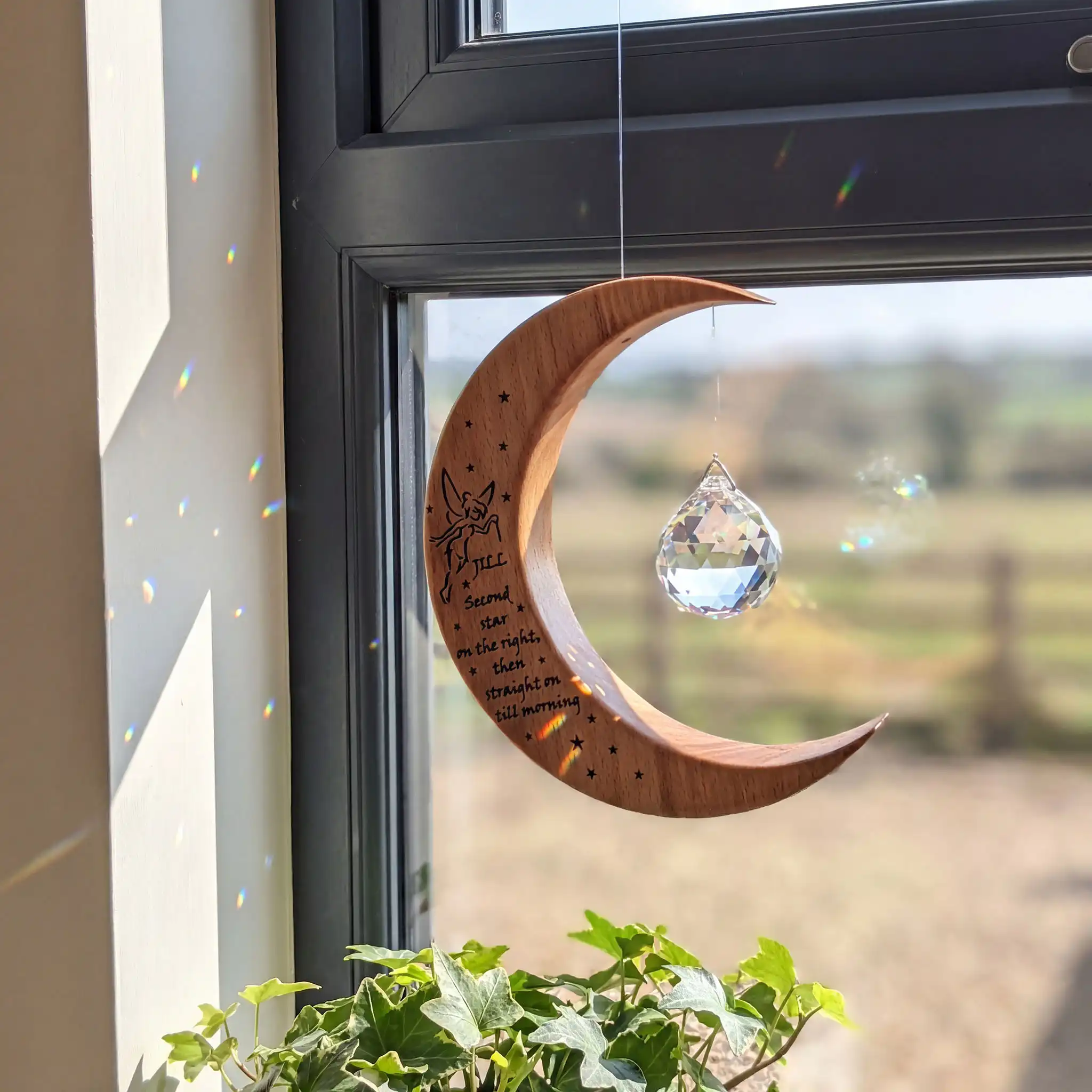 This personalised wooden gift is a Large Wooden Moon Suncatcher, handmade by us in Co. Leitrim, Ireland.