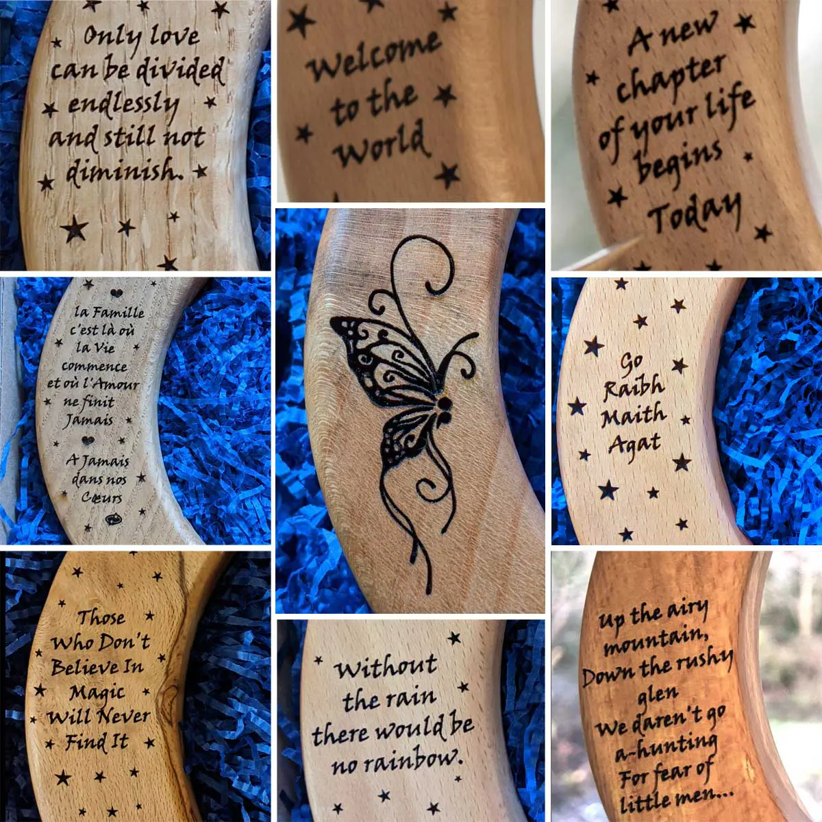 The wood can be engraved with a name, date, short message, quote, or a simple image of your choice. If you wish, we can also add small stars around the engraving.