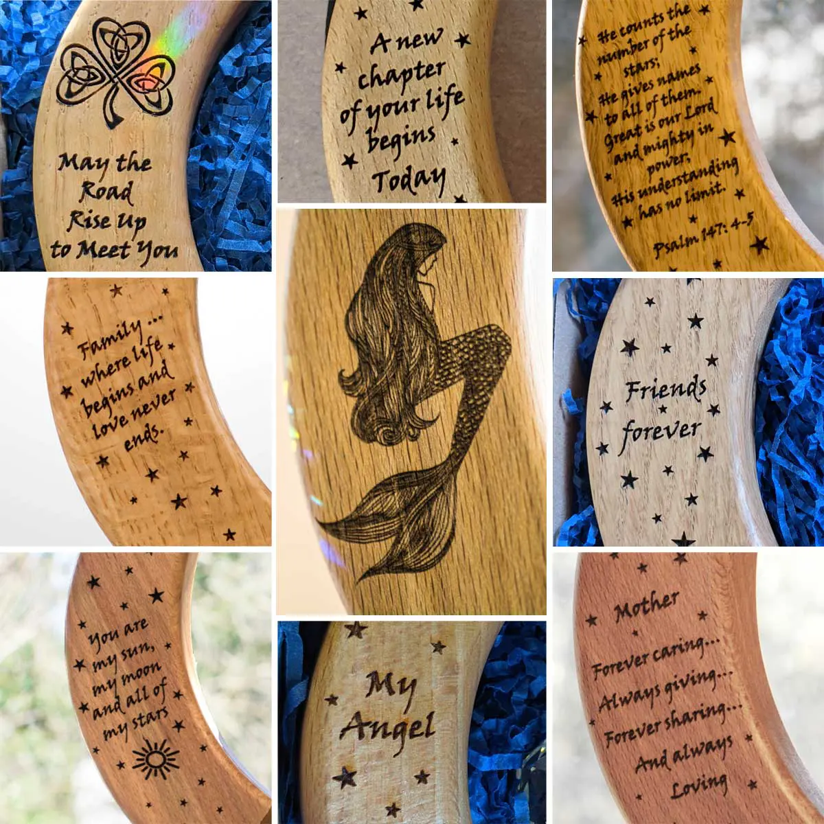 I bought a personalized birch moon shaped sun catcher as a gift for a friend. It was perfect. It is a quality piece at a good price. I will be buying another one for my son. Great company, great products.